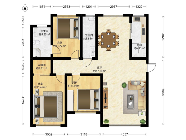 房屋戶型: 3 室2廳 1 廚2衛(wèi)